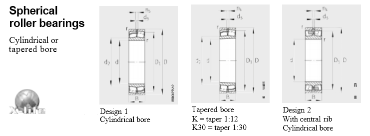 The inner rings have cylindrical or tapered bores. The symmetrical barrel rollers orient themselves freely on the concave outer ring raceway. As a result, shaft flexing and misalignment of the bearing seats are compensated, see section Compensation of angular misalignments.