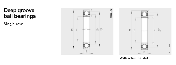 Single row deep groove ball bearings are of a simple design, robust in operation and easy to maintain. Due to their low frictional torque, deep groove ball bearings are suitable for high speeds. Deep groove ball bearings with standardised main dimensions and standardised designations (DIN 625-1) are used, for example, in gearboxes, electric motors, converter drive units and roll stands. Deep groove ball bearings with non-standardised designations