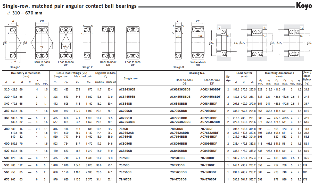 (mm) Single row         Matched pair Single row Back-to-back DB Face-to-face DF Mass