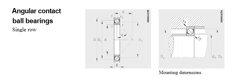 FAG Single row angular contact ball bearings are, with a few exceptions, self-retaining units with solid inner and outer rings and ball and cage assemblies with cages. The raceways of the inner and outer rings are offset from each other along the bearing axis. The angular adjustment facility of these bearings is very limited.