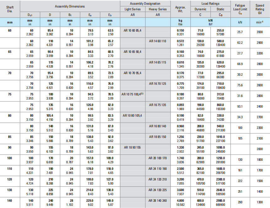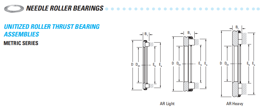 of the bearing components allows the use of many design arrangements. As an example, for less demanding applications, it is possible to combine metric series, thrust cylindrical roller and cage assemblies, including the metric series heavy thrust washers (LS, CPR) and even the metric series thin thrust washers (AS, CP).