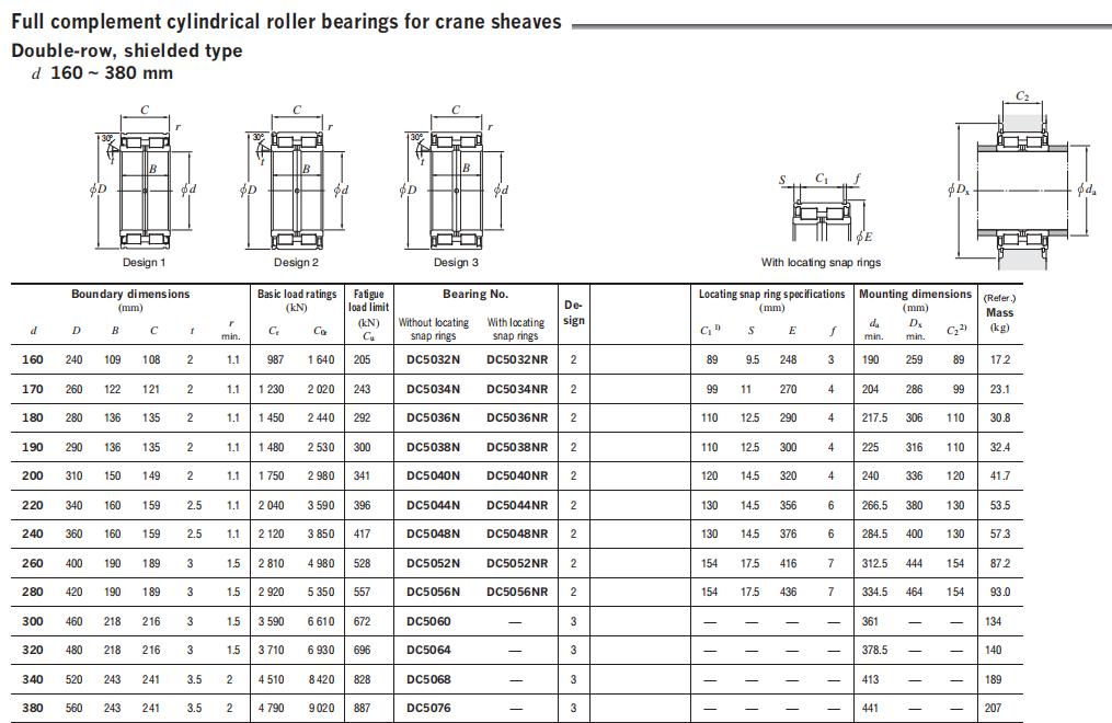 KOYO Full complement cylindrical roller bearings, since full complement type cylindrical roller bearings can incorporate more rollers than bearings with cage, the load rating can be increased.Bearings on the fixed side is capable of withstanding radial load and axial load in both directions. The shielded bearing is specially designed for crane sheave.