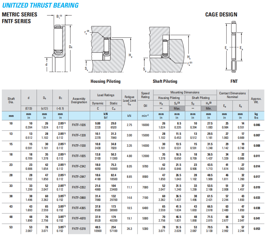 On FNT and AXK series thrust needle roller and cage assemblies, the cage bore has a closer tolerance than the outer diameter. Therefore bore piloting is preferred for these assemblies. To reduce wear, it is suggested that the piloting surface for the cage be hardened to an equivalent of at least 55 HRC. Where design requirements prevent bore piloting, the FNT or AXK series thrust needle roller and cage assemblies may be piloted on the outer diameters. For such cases, suitable O.D. piloting dimensions should be determined. Mounting tolerances are given in Table B6-8 on page B-6-10.