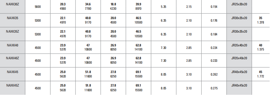| NAXK40 | 23.9 | 47 | 7.3 | 2.85 | 0.224 | JR35x40x20 | 40 |