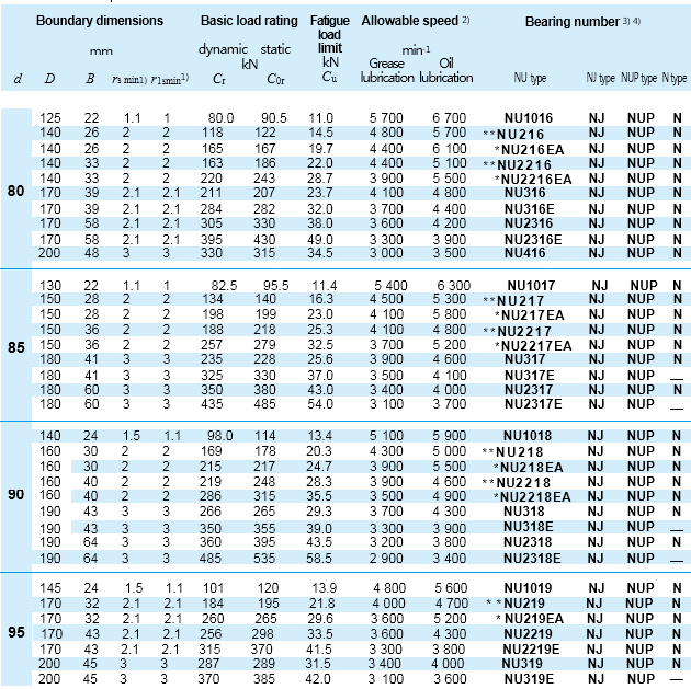 90   160 40 315 35.5 3 500 4 900 NU2218EA NJ NUP N