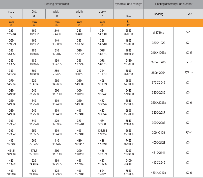 Please refer to Timken cylindrical roller Bearing catalog (order no. 10447) for more information on our complete range of single- and multi-row cylindrical roller bearings in sizes from 65 mm (2.559 in.) to 1040 mm (40.945 in.) bore.