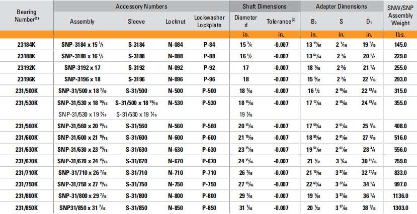 The table below shows dimensions for adapter assemblies and components used in the mounting of tapered bore bearings on shafts.