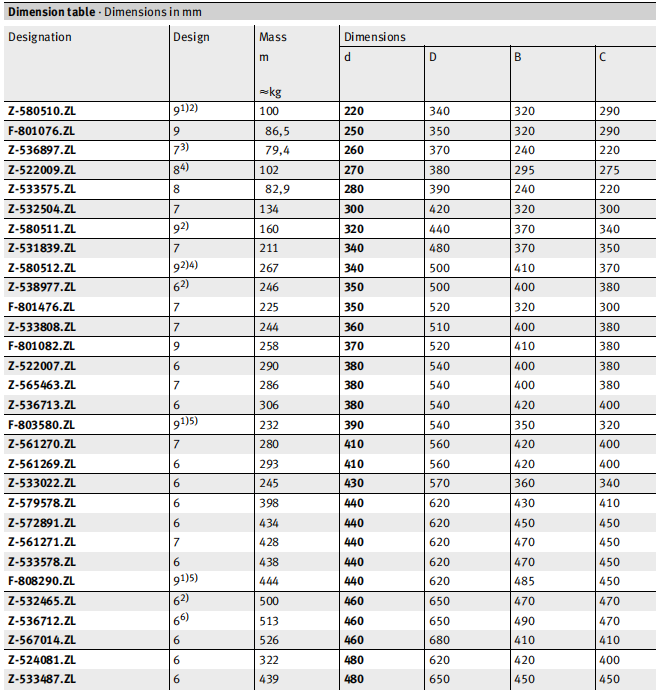 Dimension table · Dimensions in mm