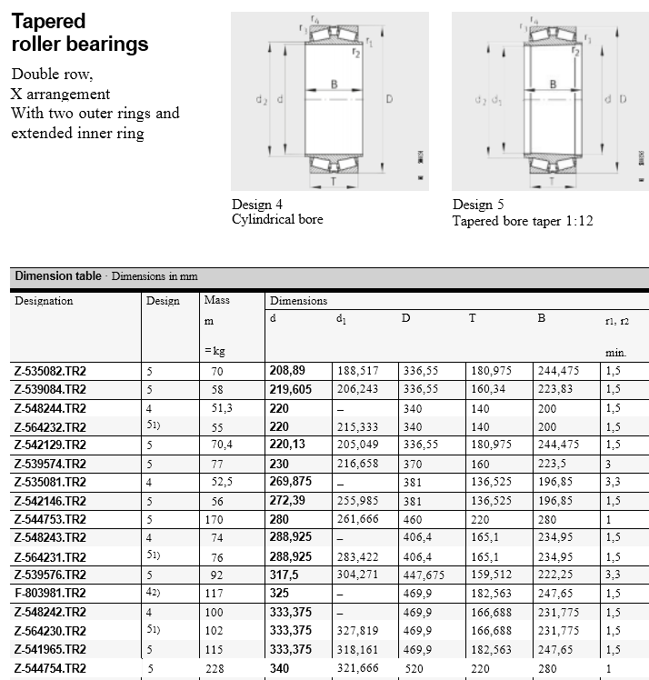 FAG  double row tapered roller bearings of various designs are special  bearings with the designation Z-5..TR2 or F-8..TR2. They comprise solid bearing rings and tapered roller and cage assemblies. The bearings are suitable for axial loads in both directions and high radial loads. Most of the bearings are separable and give a loose fit on the journal. The complete bearing is then mounted in the chock, after which the chock together with the bearing is slid onto the journal. The exception is bearings with an extended inner ring and tapered bore. These give a tight fit on the journal.